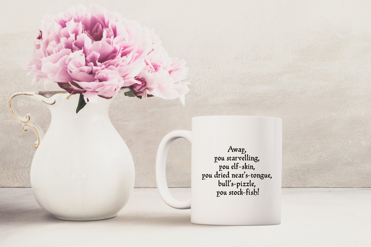 A Shakespearean way to say get lost, leave me alone and let me drink my coffee in peace!This particular piece of wit is taken from Henry IV Part I (Act 2, Scene 4) - "Away, you starveling, you elf-skin, you dried neat's-tongue, bull's-pizzle, you stock-fish!" -------------------------------------------A classic ceramic white mug. Dishwasher and microwave safe.--------------------------------------------Available in 11oz or 15oz size. Please choose from drop down menu. The perfect amount for your hot beverage without worrying about refills!The quote is printed on both sides of the mug.Please feel free to contact me should you have any questions regarding your order - georgia@bookquotedecor.com PLEASE NOTE: We do not accept returns on our MUGS as each one is made to order for each individual customer.