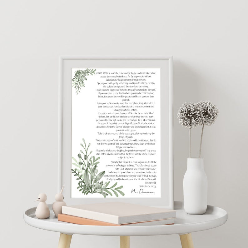 Bring a touch of wisdom and serenity to your home with this beautifully designed Desiderata poem print by Max Ehrmann. This classic piece is paired with soft botanical illustrations, making it a meaningful and stylish addition to any space. A reminder to live with grace, patience, and kindness, this print is perfect for your home, office, or as a thoughtful gift.