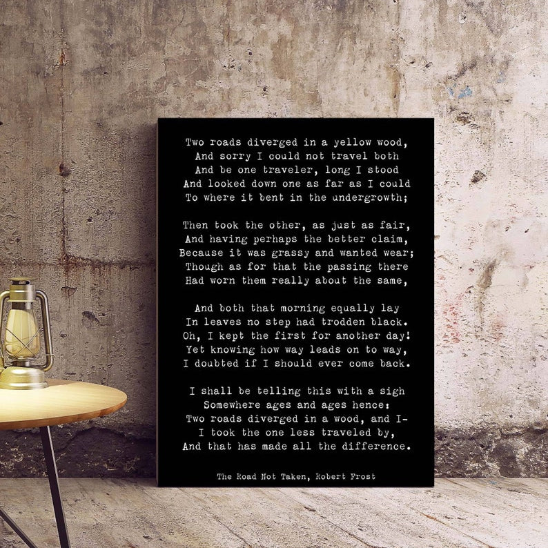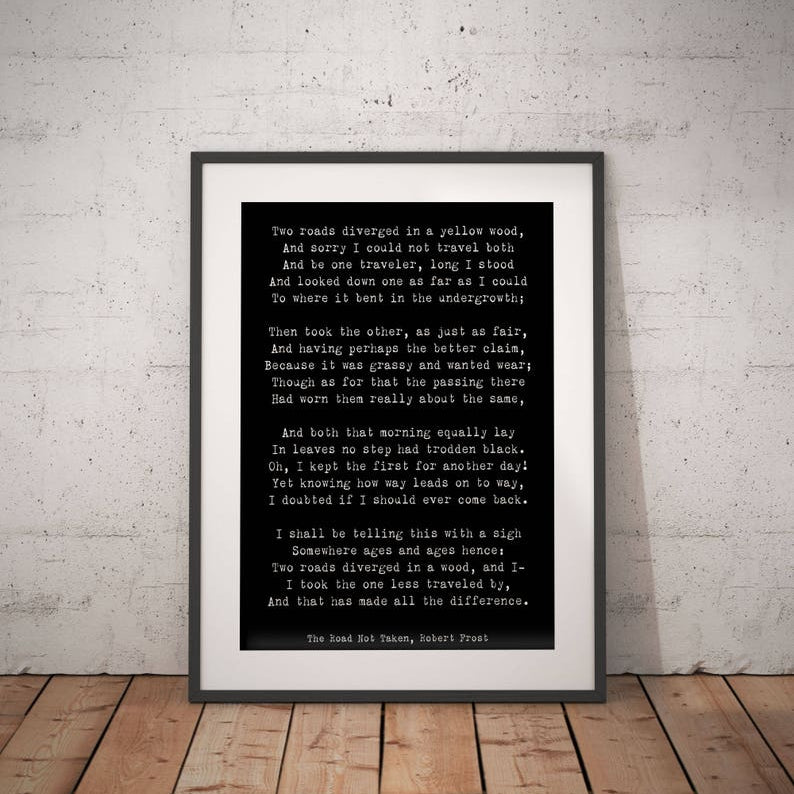 Black and white art print of the beautiful and inspiring Robert Frost poem: 'The Road Not Taken'.
